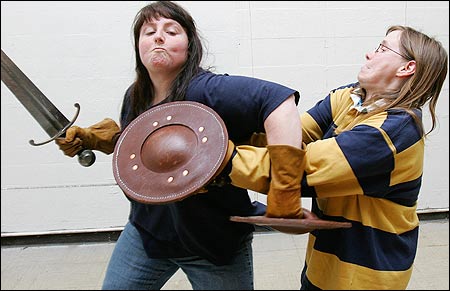 *Real caption:* Holly Hunt of Shrewsbury and Amy West of Putnam, CT, re-create a fighting technic described in a historical manual on warfare during a meeting of the study group at the Higgins Armory Musuem. *Globe Photo* |
