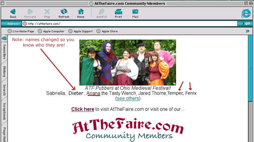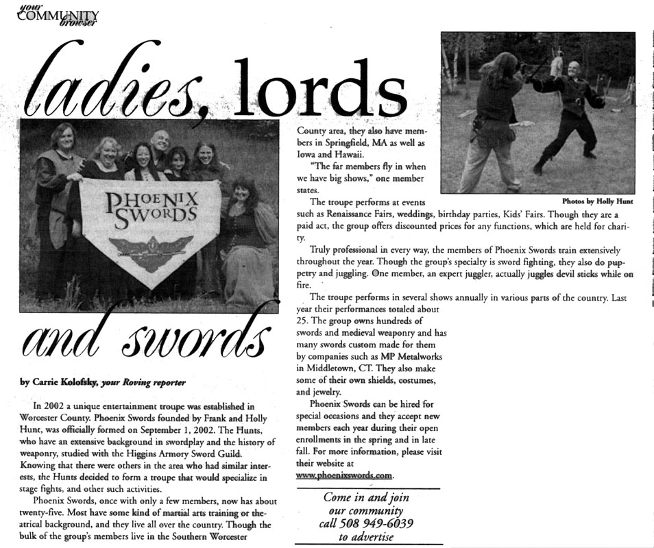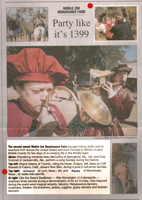Perrin highlighted in an article with this photograph from the Capital Weekly Landmark Article -A Cut Above, Local Women are Renaissance Faire Performers (all about Valkyrie and Rowan) Hestia, Minyon and Dieter featured as part of a photo gallery at Gulf Coast Renaissance Faire Independent News- In Weekly Article-Lord of the Sword The Advocate of Stamford CT, talks to kids about some of their favorite parts of the ISD Renaissance Faire Temper and Fenix are photographed and quoted for a Boston Globe Article Sometimes it's not so flattering (but we are good sports anyway) Boston Globe "Name that caption" contest. Ladies, Lords and Swords in Your Community Browser Featured in the Metro Section of the Mobile Register Member quoted in Christian Science Monitor Article (Frank/Fenix) Members featured on opening page of Atthefaire (Screen shot)